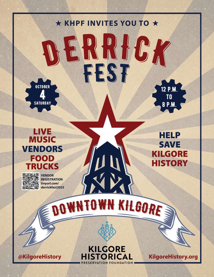 Presented by the Kilgore Historical Preservation Foundation Save the date Saturday, October 4th! This year we invited you to Derrick Fest at Downtown Kilgore....